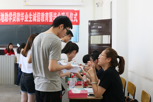 活动现场,各学院资助辅导员对本学院生源地助学贷款毕业生的相关材料进行了审核,逐一为学生详细解读了贷款正常还款、提前还款、逾期还款、毕业确认、信息变更等政策及办理手续,号召贷款学生关爱信用记录、知晓征信的重要性及逾期还款的后果,向学生普及了相关案例,并向学生下发了《生源地助学贷款还款指南》、《关爱信用记录》折页。学生资助管理中心工作人员对学生的材料进行了复核,并在国家开发银行助学贷款管理系统内为学生办理了毕业确认手续。