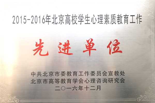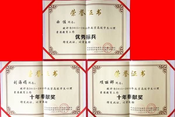 根据各高校心理咨询中心在2015-2016年的工作开展情况,北京高教学会心理咨询研究会评选出先进集体、突出进步集体和先进个人、优秀标兵及十年奉献奖等若干奖项,并在会上予以表彰。我校心理健康教育咨询中心被评为“2015-2016年北京高校学生心理素质教育工作先进单位”,副主任曲佳荣获“2015-2016年北京高校学生心理素质教育工作优秀标兵”称号,主任刘海娟、副主任(兼)项丽娜荣获“2015-2016年北京高校学生心理素质教育工作十年奉献奖”。
