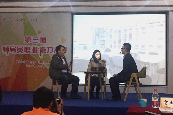 1月10日下午,校学工处兼研工处处长安宇作为邀请评委,带队前往中国石油大学昌平校区参加该校第三届辅导员职业能力大赛。学校统一租车,思想教育科科长,各学院学工办主任,我校近两年专职优秀辅导员,一行12人到场观摩学习。