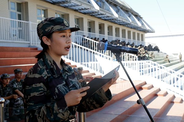 学生代表程奕茹代表全体参训同学对学校和教官致以崇高敬意和真诚感谢,她回顾了10天来丰富而难忘的军训经历,表示将以军人的高昂斗志和奋斗精神在自己的逐梦道路上不断向前。