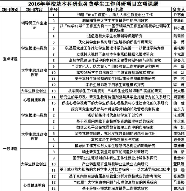 依照我校2016年度学生工作专项研究课题申报工作的通知精神,申报内容涵盖本科生导师制、辅导员工作室建设、学生管理与资助、大学生思想政治教育、大学生就业创业、心理健康教育等六项内容,经项目评审委员会初评,申请人汇报,终评,确定15项重点课题,14项一般课题。