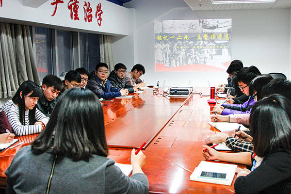 为纪念“一二•九”运动80周年,校团委于12月9日举行了“铭记一二九•立誓传青志”为主题的座谈会。校团委书记张蕊,校团委宣传部部长桑婷婷以及来自新媒体工作室、校院级学生组织的主要学生干部共计20余人参加座谈会。