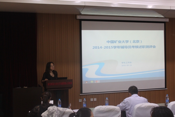 9月23日上午8点30分,学工处在民族楼135会议室举行中国矿业大学(北京)2014-2015学年辅导员考核述职测评会。学工处处长安宇,副处长刘海娟、白云鹤、高洁、张蕊,资源学院分党委副书记杨大鹏、力建学院分党委副书记王前飞、文法学院分党委书记董会泽,学工处、团委全体工作人员及来自9个学院的53名专、兼职辅导员出席了会议,其中39名辅导员做了年度工作述职汇报。会议由刘海娟主持。