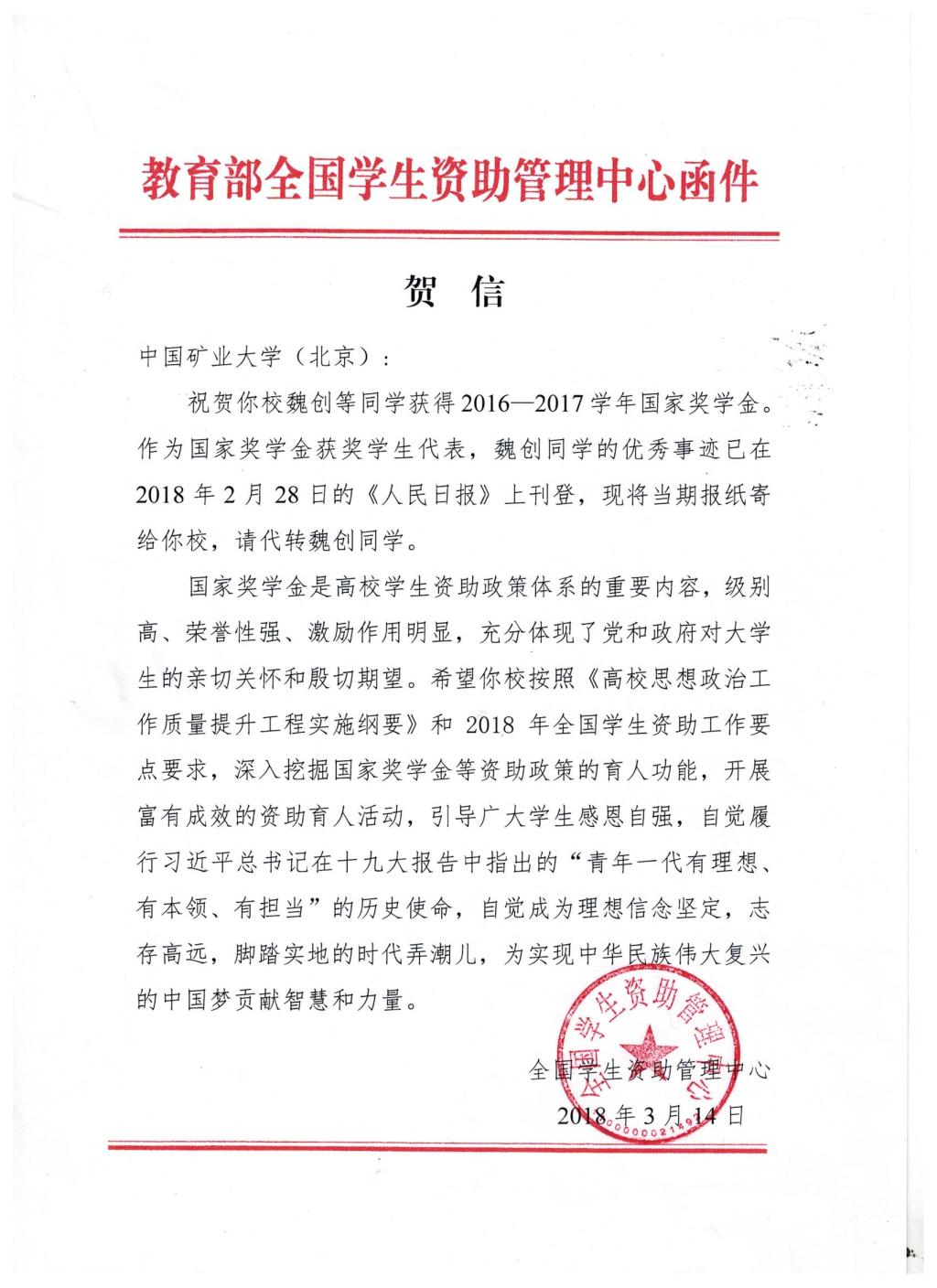 国家奖学金是为了激励普通本科高校、高等职业学校和高等专科学校学生勤奋学习、努力进取,在德、智、体、美等方面全面发展,由中央政府出资设立的奖励特别优秀学生的奖学金,级别高、荣誉性强、激励作用明显,充分体现了党和政府对大学生的亲切关怀和殷切希望。经严格选拔、评审,每年约有5万名优秀大学生获此荣誉。今年年初,经各省市和全国各高校推荐及专家评审,这5万名大学生中有100人脱颖而出,成为国家奖学金获奖学生代表,并在《人民日报》刊发。魏创是首位被《人民日报》刊发个人事迹的我校获得国家奖学金的学生。我校首次收到教育部全国学生资助管理中心发来的贺信,这是对我校学生资助工作的重大肯定和极大的鼓励。(魏创个人事迹:http://news8.cumtb.edu.cn/info/1003/11369.htm)