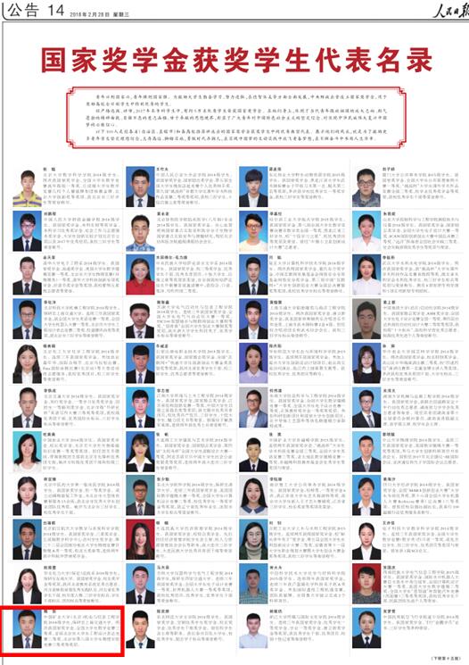 近日,教育部全国学生资助管理中心向我校发来贺信,祝贺我校魏创等同学获得2016-2017学年国家奖学金。作为国家奖学金获奖学生代表,魏创同学的优秀事迹已在2018年2月28日的《人民日报》上刊登。
