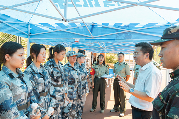 随后,王忠强来到设于操场北侧的校医院临时医疗点,询问医疗保障工作的有关情况,并与身体不适学生亲切交谈,详细了解他们的身体状况、患病原因及就医情况。他叮嘱学生们规律饮食、规律作息,根据身体的真实状态适当参与训练,并希望学生们能借军训之机养成坚持运动的好习惯,提高身体素质。同时,他要求各连指导员密切关注学生的身体状况,掌握好训练节奏与训练力度,勉励学生发挥不怕苦、不怕累的精神,鼓励他们坚持完成训练。