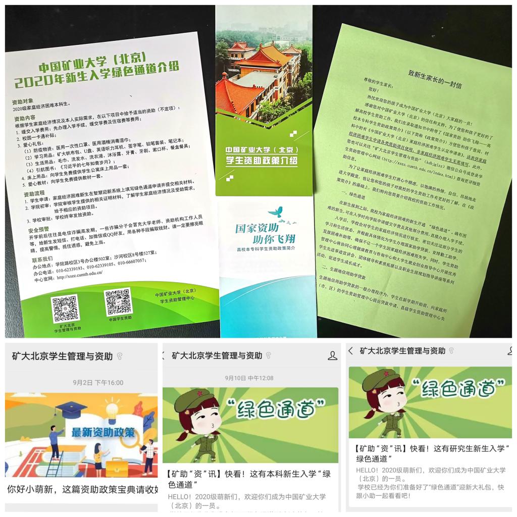 2020年,中国矿业大学(北京)高度重视家庭经济困难新生入学工作,以精准研判学生需求、激励学生成长成才为工作目标,在充分保护学生隐私的工作前提下,充分借助信息化技术,通过广泛宣传资助政策、个性定制资助礼包等工作途径,切实抓细“绿色通道”各项工作,为家庭经济困难新生带去暖心服务、无声关爱,确保每一位新生都能顺利入学。