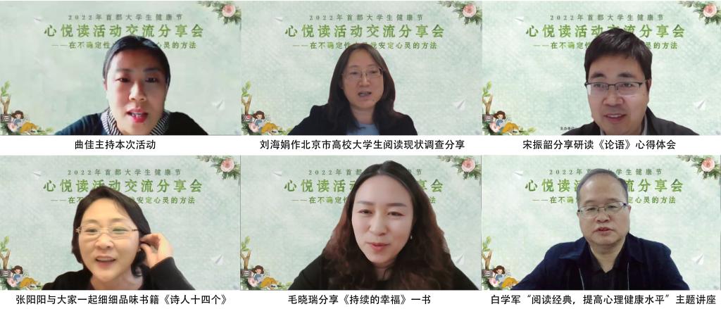 本次活动拉开了2022年首都大学生健康节“心悦读”活动的序幕。活动由我校承办,旨在开展优秀经典书籍的阅读、心灵感悟和传承分享。通过阅读活动,丰富学生精神世界,升华心灵,还可以分享读书观点,用身边人感染身边人,以此来传播当代大学生青春正能量,扩大活动辐射度与影响力,活动目前已在北京市形成了心悦读品牌特色。