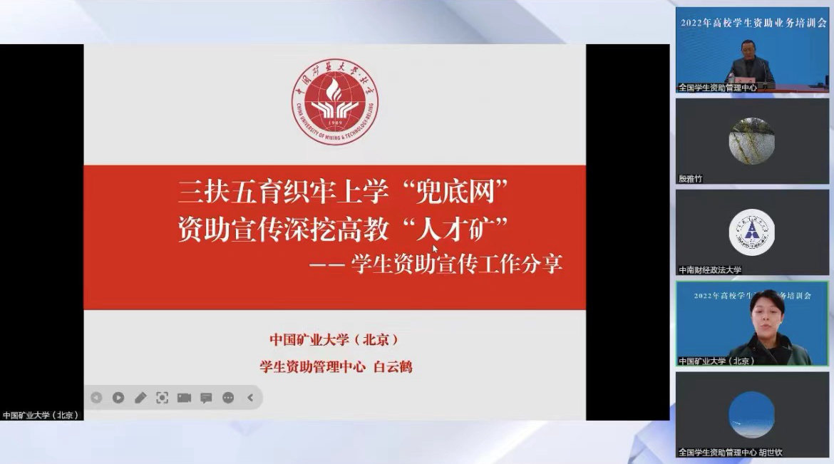 为全面落实各项资助政策,进一步规范学生资助工作流程,提升学生资助工作队伍业务素质,教育部全国学生资助管理中心于10月28日面向全国各省、市、高校的学生资助部门,开展学生资助业务培训会。我校学生工作处副处长、学生资助管理中心主任白云鹤应邀在培训会上从精准开展政策宣传、多措提升育人实效、激励学生自立自强三个方面介绍学生资助宣传工作的经验做法。