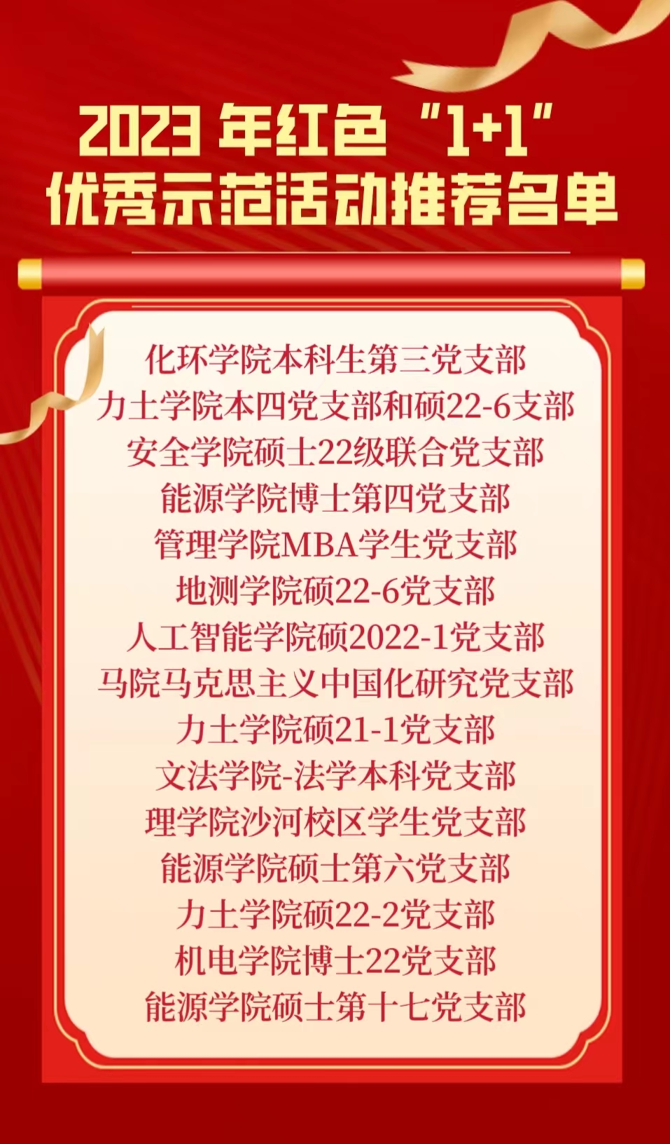 本次红色“1+1”共建活动自 5 月份启动以来,得到了各学院学生党支部的积极响应, 共申报创建完成红色“1+1”项目 57 个。经过开展共建、中期验收、活动总结、学院推荐等多个环节,19 个党支部进入评比展示。会上,各支部展示了红色“1+1”共建活动的成果,评委们对各学生党支部的共建活动成果表示肯定和鼓励,并针对汇报情况提出了问题和建议,与支部进行了进一步交流。根据评审标准和各支部共建情况,结合北京市教工委核定推荐名额,学校择优推荐 15 个红色“1+1”优秀示范活动参加 2023 年北京高校红色“1+1”评选示范活动。