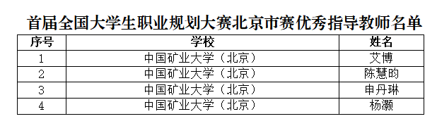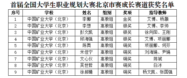 北京市教委于2023年10月启动首届全国大学生职业规划大赛北京市赛,共有76000余名学生参赛。我校于2023年11月至12月组织开展校赛选拔,来自12个学院的800余名选手报名参赛,在成长赛道和就业赛道高教组的比赛中共有21名选手脱颖而出,晋级市赛的比拼。参赛学生立足自身的专业特点和行业需求,围绕自身未来规划与职业目标、个人在校期间的学习成长、实习实践经历、个人综合素质、职业发展规划等方面进行了充分的展示。最终,在市赛成长赛道和就业赛道高教组的比赛中我校夺得2项金奖、6项银奖、13项铜奖的佳绩,充分展现了矿大学子的能力素质与责任担当。其中,艾博、陈慧昀、申丹琳、杨灏被评为北京市赛优秀指导教师。