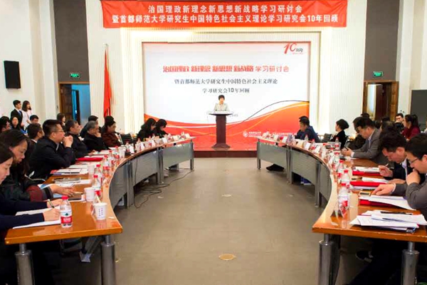 4月18日下午,首都师范大学"治国理政新理念新思想新战略"研讨会在校本部实验楼报告厅举办。我校马克思主义读书会与清华大学、中国人民大学、北京科技大学、中国人民公安大学、中国青年政治学院等兄弟高校的研究生代表应邀参加。新华社、人民日报、北京电视台等多家媒体现场报道。 会上,首都师范大学研究生院常务副院长、研究生工作部部长梁占军教授致辞。他从时代需求、学科建设以及学校研究生培养目标等方面阐述了高校思想政治理论建设的重要性和必要性,并对与会领导和嘉宾表示欢迎和感谢。 会议进行了研究生中国特色社会主义理论体系学习研究会10年回顾活动,现场播放了理研会10年回顾专题片,首都师范大学外国语学院辅导员、理研会2013级主席张志杰作了理研会10年发展报告,总结了十年来理研会在“学理论讲理论用理论”发展模式下,“用思想引领青年,用特色培育精品,用创新促进发展,用理论凝聚力量”所取得的成果与经验。 北京大学马克思主义学院副院长程美东教授作了治国理政专题报告。他从政治文化的高度解读了十八大以来党中央的政策,全面深入地诠释了治国理政思想内涵。清华大学李璎珞、北京科技大学袁正臣、中国青年政治学院巩彦博、中国人民大学刘晋礽、首都师范大学刘阳河从高校青年学子的使命与担当、坚持正确舆论导向严肃党内生活、知识分子在社会主义现代化建设中的作用、中国梦五个不同角度分别做了主题发言。 北京市委讲师团成员、首都师范大学马克思主义学院李松林教授作了深刻点评并对治国理政的科学内涵做了详细阐述。理论中心指导老师们依次作了讲评发言。希望同学们要在学习经典著作中把握时代前进方向和精髓,在关注国内变化的同时具备国际视野,不断提升政治意识。梁占军做总结发言,他表示治国理政学习是实现中华民族伟大复兴现实发展的需求,希望我校研究生要做到理论学习与实践相结合。 此次活动是对研究生理论学习"学、讲、用"特色模式的丰富总结,对于引导我校马克思主义青年读书会成员增强“四个意识”,坚定“四个自信”,提升思想政治素养,促进全面成长成才具有重要意义。 |