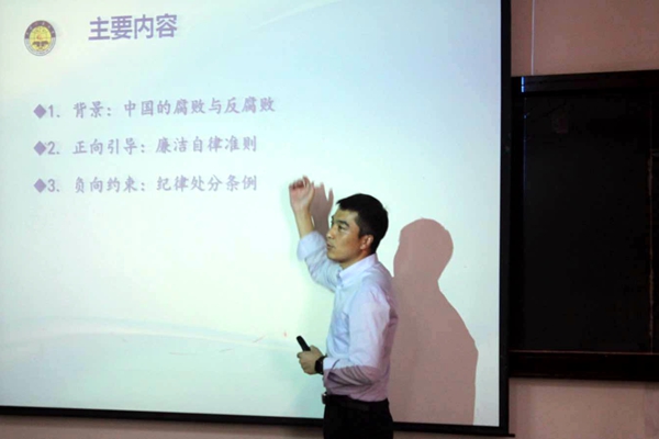 此次党课主题为“党风廉政建设法规解读”。文法学院副院长、校廉政研究中心执行主任刘金程老师围绕党风廉政建设,从中国的腐败和反腐败、正向引导、负向约束三个层次,向党员全景展示了中国共产党与中国政府反腐败进程与成果,尤其是党的十八大以来反腐倡廉的辉煌成就;深入解读了《中国共产党廉洁自律准则》、《中国共产党纪律处分条例》,引用正反两方面的例子引导广大党员要先公后私、崇廉拒腐、尚俭戒奢、甘于奉献,党员干部要廉洁从政、用权、修身、齐家;要牢牢守住“底线”,把纪律挺在前面,永葆先进性和纯洁性。