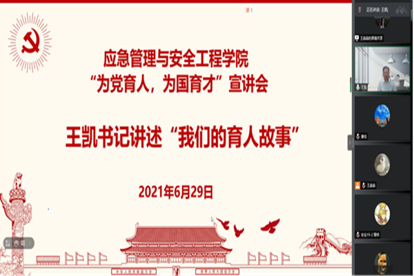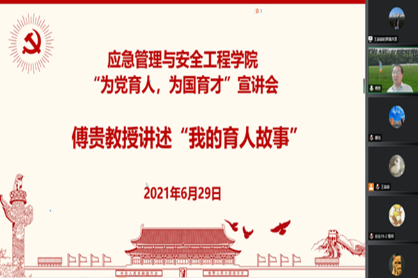 为贯彻落实习近平总书记在清华大学考察时的重要讲话精神,6月29日,应急管理与安全工程学院线上举办“为党育人,为国育才”宣讲会,院党委书记王凯与傅贵教授分别讲述“我们的育人故事”和“我的育人故事”,全院400余名师生参会。