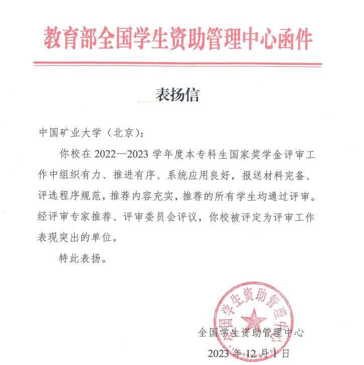 日前,教育部全国学生资助管理中心向我校发来表扬信,对我校2022-2023学年度本科生国家奖学金评审工作进行表扬。